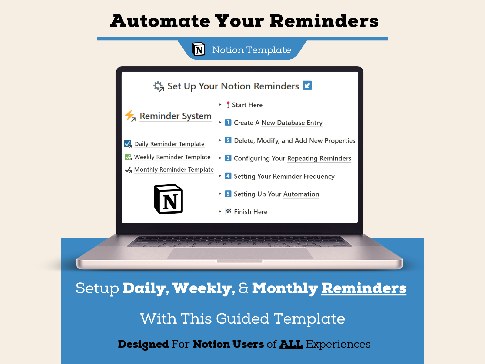 This Notion template is optimized to setup repeating reminders and notifications on your device(s) automatically after configuration (desktop, laptop, tablet or phone). View Template Video âž¡ https://screenpal.com/watch/c0V33kVw9q6