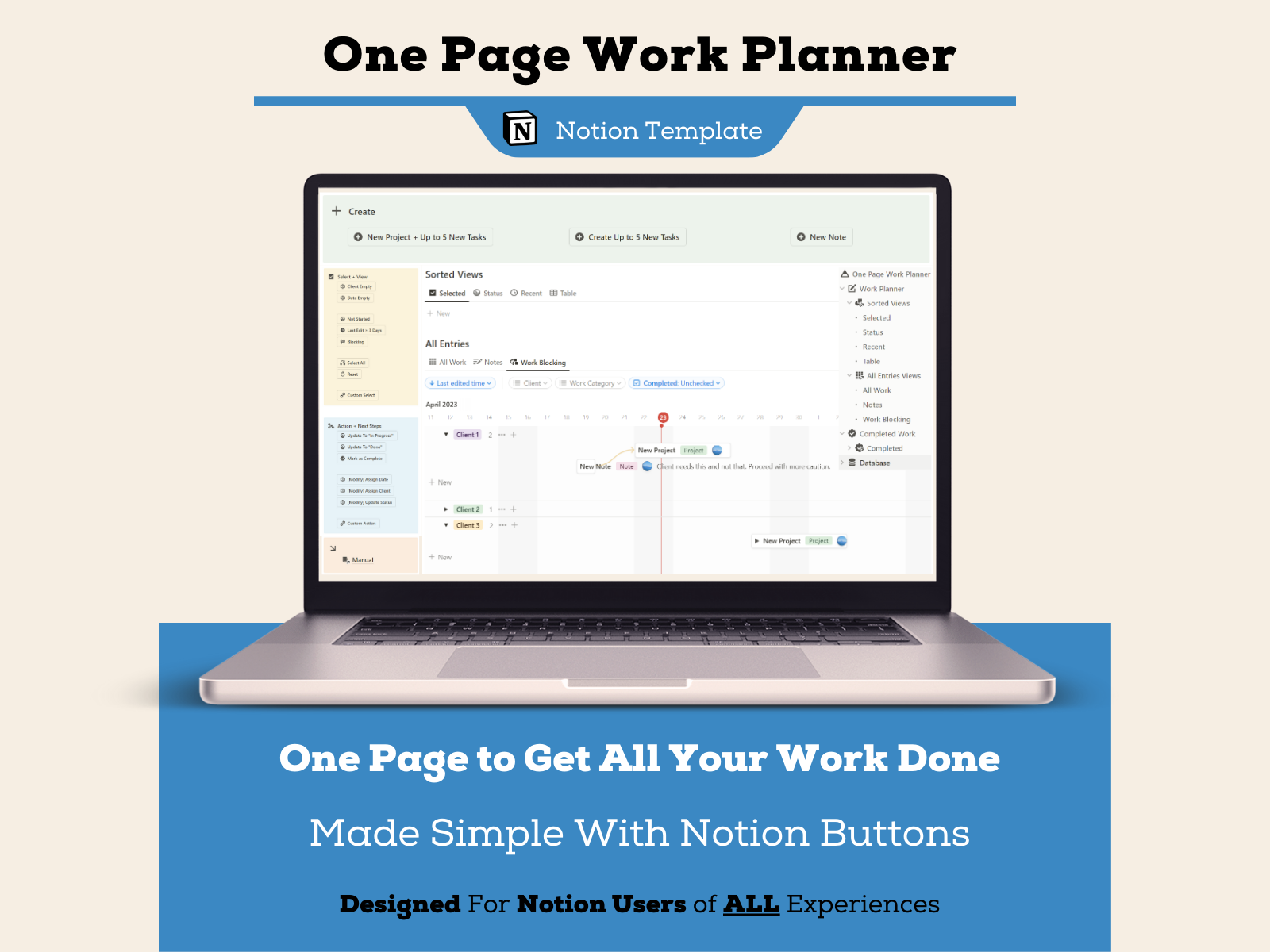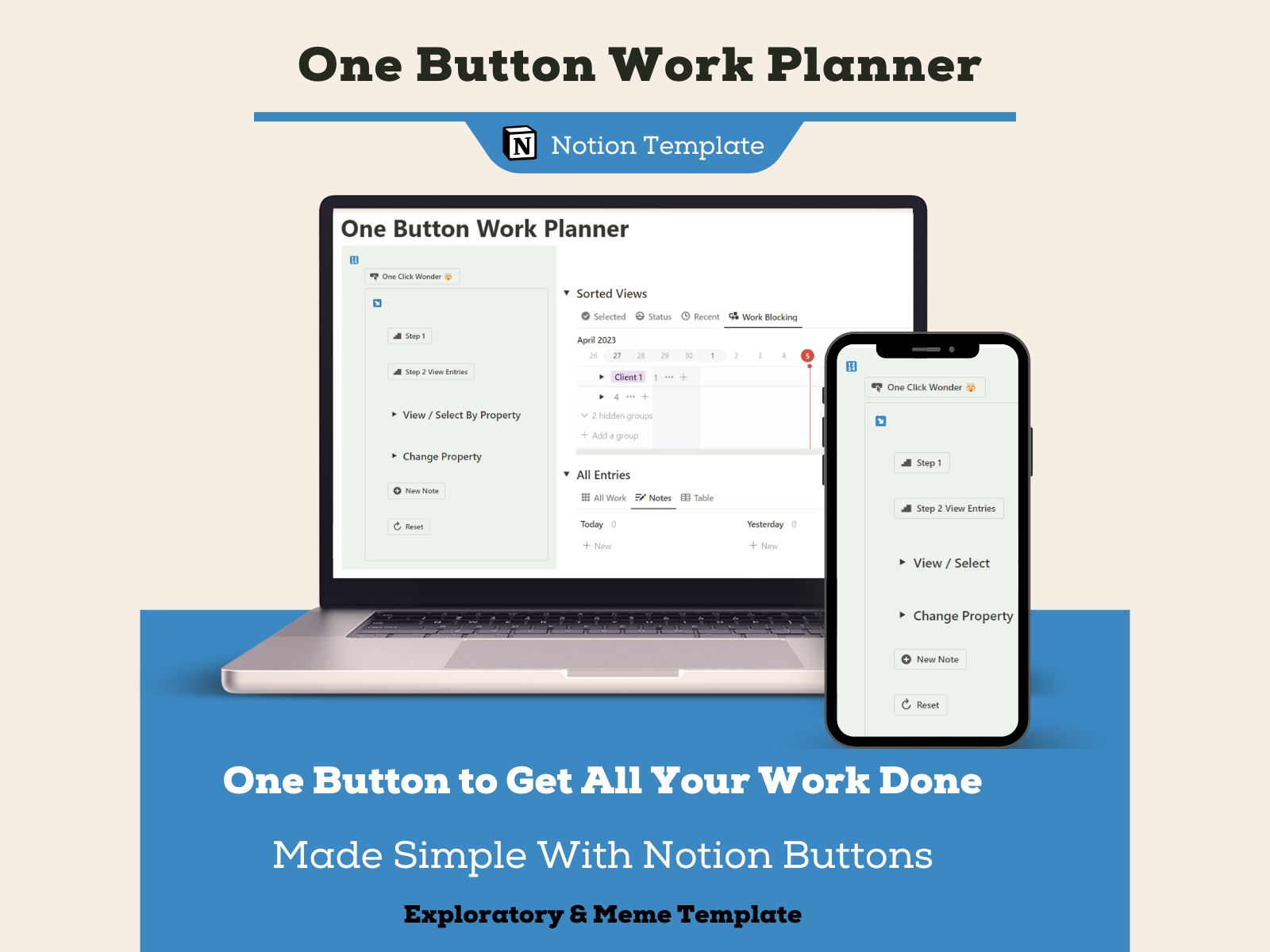 This exploratory template contains just one Notion button that clusters into 20 other Notion buttons to perform all work planner related actions in one place. This experimental template just begins to show the power of Notion buttons as a whole. View Template Video âž¡ https://screenpal.com/watch/c0hh38VzNG8